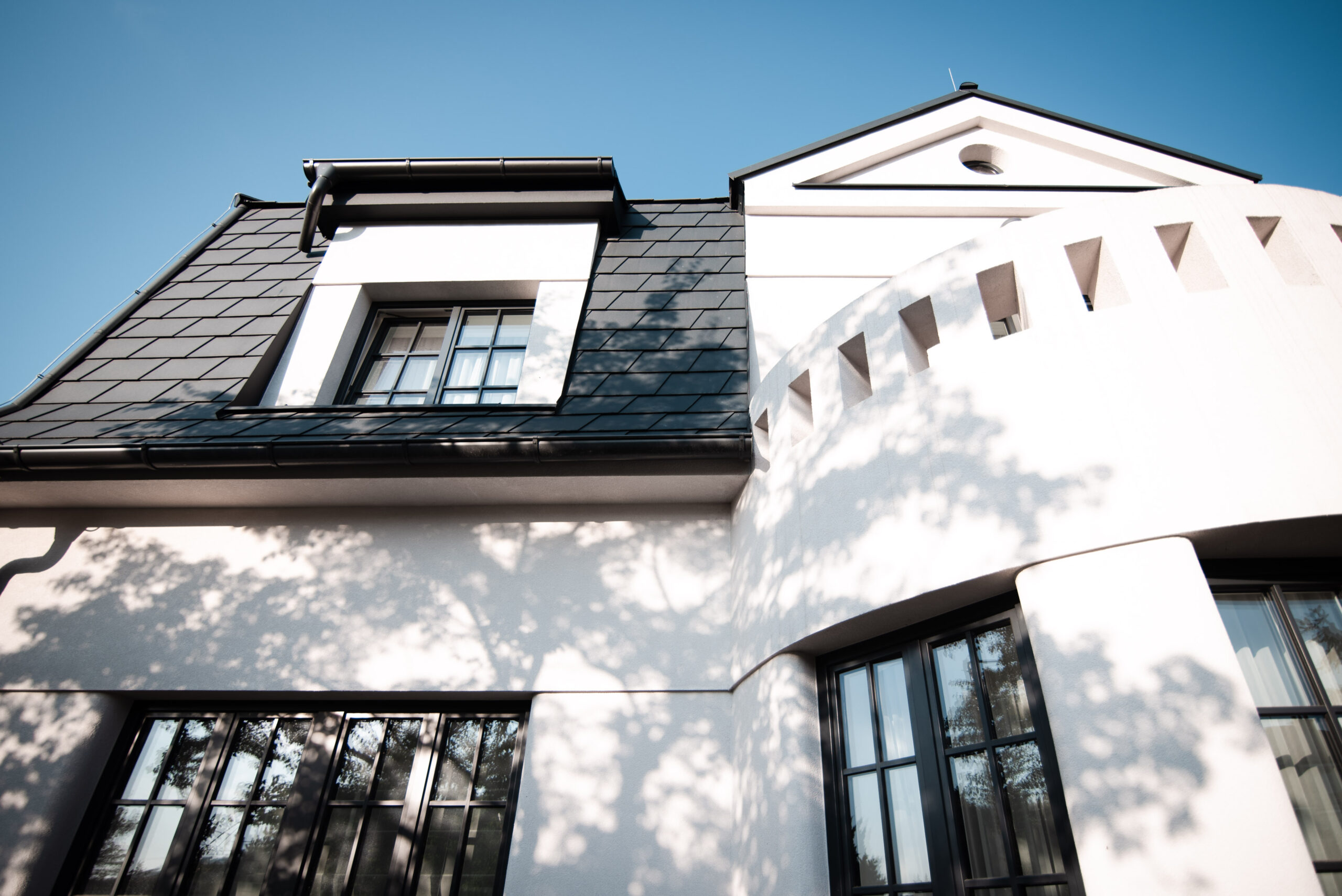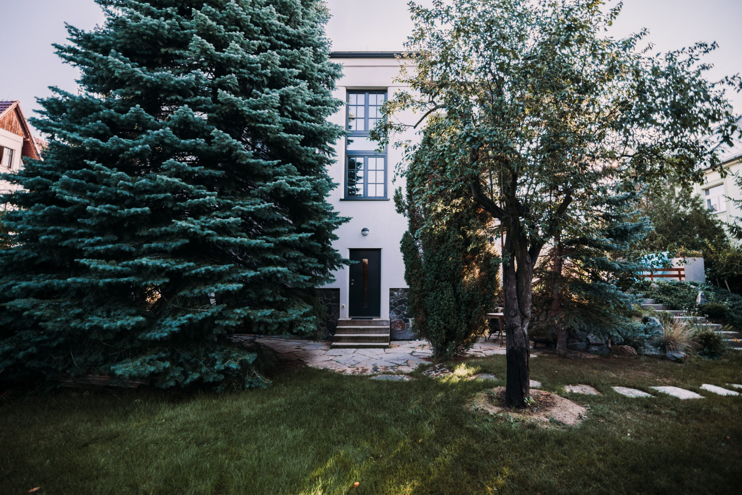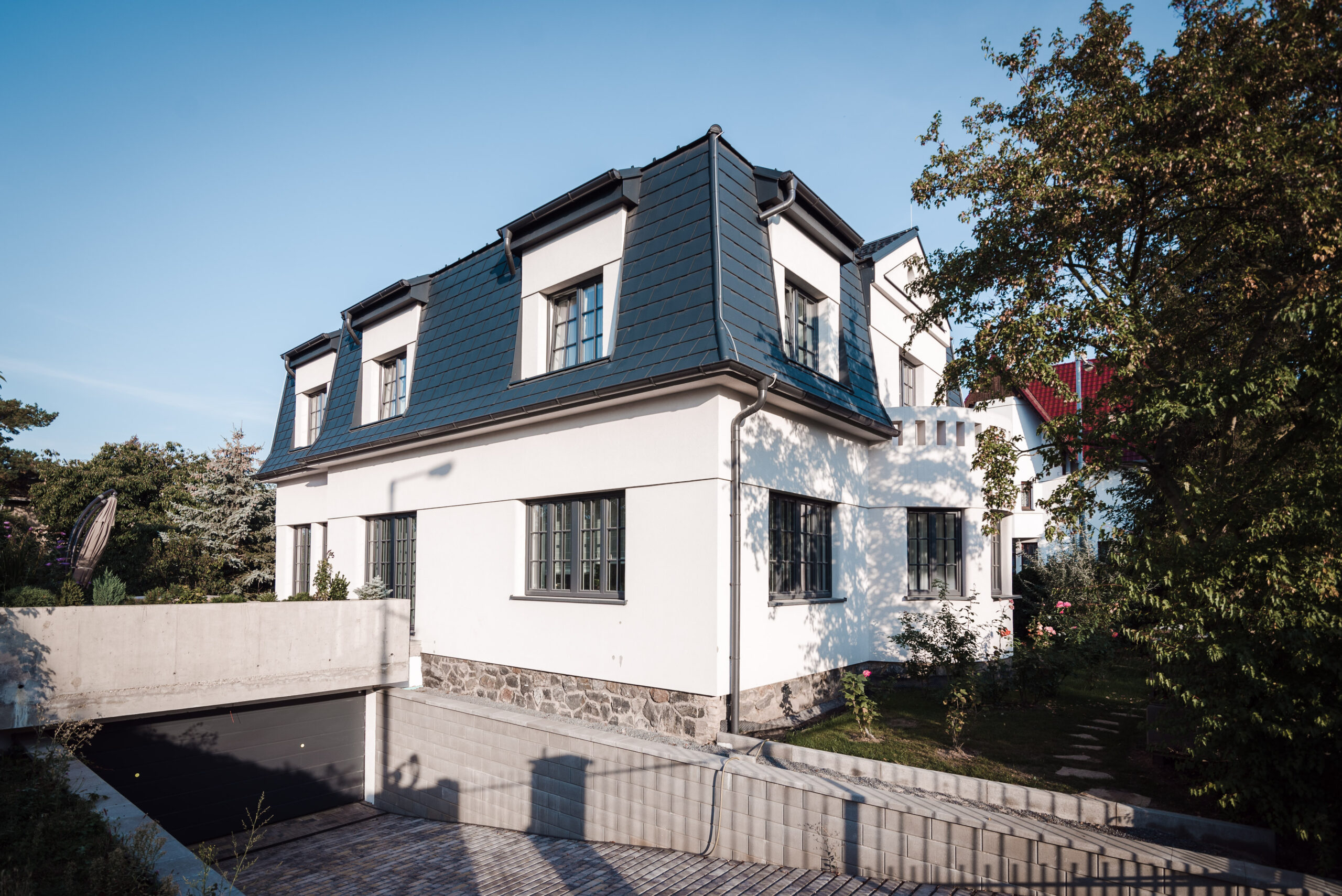 Návrh vily Blažena. Podstatou architektonického řešení je co možná nejvěrnější zachování objemových, výtvarných a tektonických kvalit původního objektu. Objekt dvojgaráže je umístěn a zapuštěn do země tak, aby co nejméně narušil architekturu původní stavby